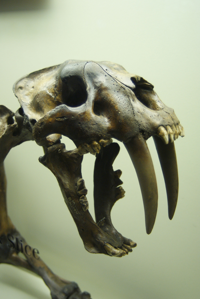 Smilodon fossil in the Page Museum at the La Brea Tar Pits; photo by Dallas Krentzel on Flickr (use permitted with attribution).