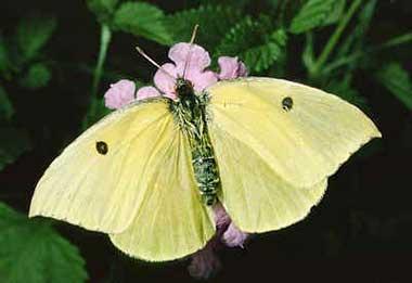 The California dogface butterfly, also called "dog-head butterfly," is found only in California. The male has markings on its wings resembling a silhouette of a dog's head. The female is usually solid yellow with a black spot on each upper wing.
