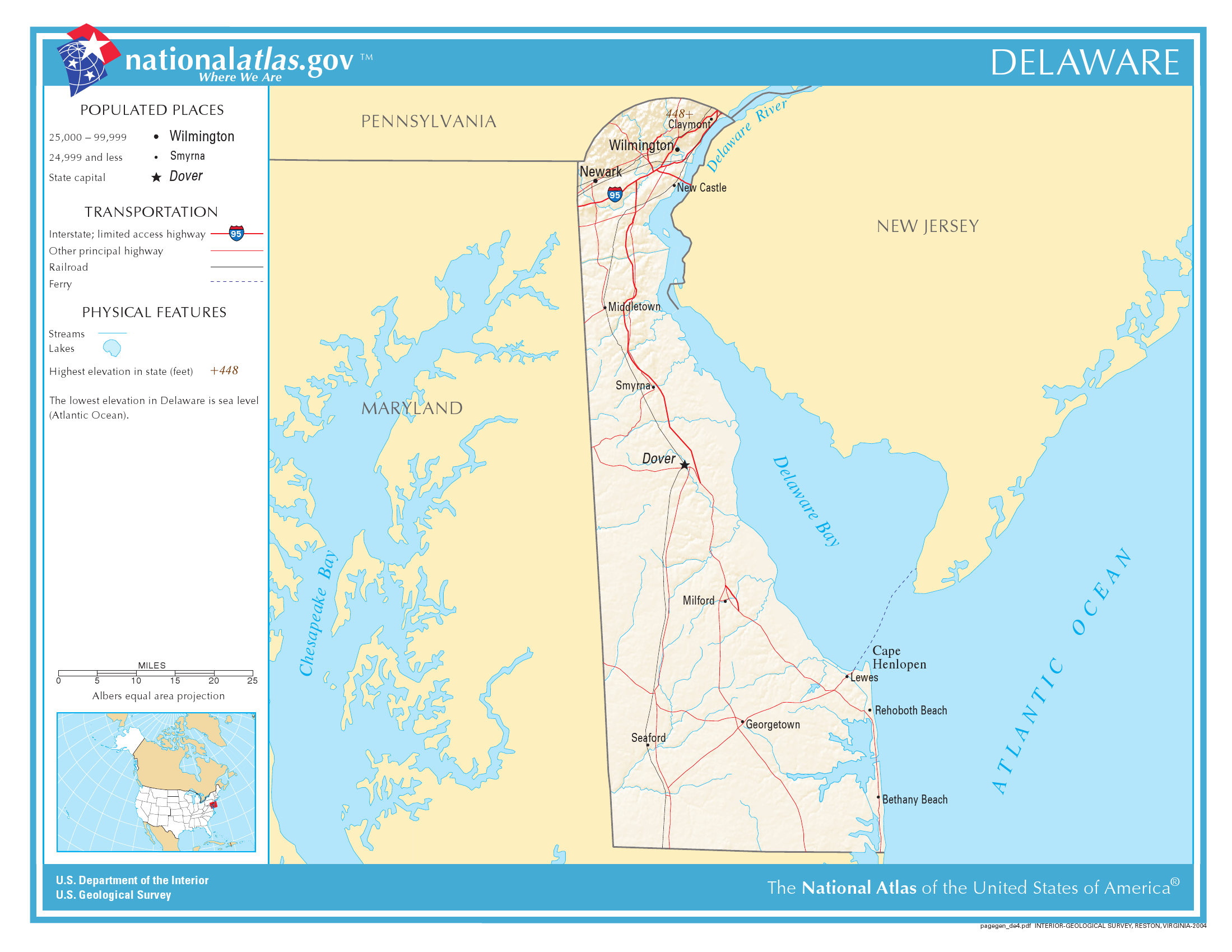 Delaware a map showing major population centers, major transportation routes, and physical features (including streams, lakes, and bays). Photo by National Atlas of the United States / Wikipedia (public domain image).