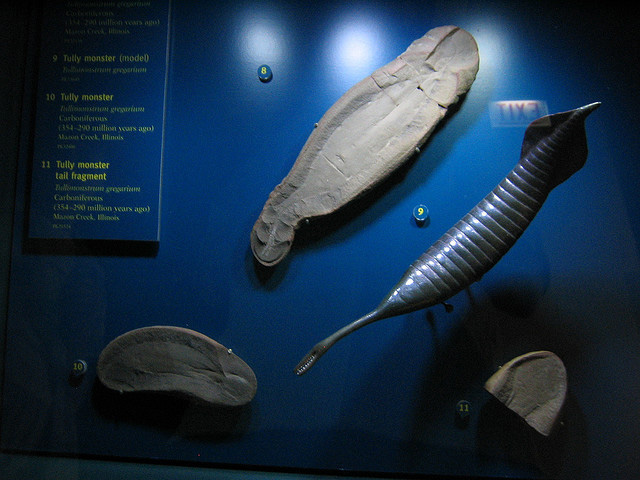 Tully monster fossil and model at Chicago Field Museum; photo by Brian Smith (brianbrarian) on Flickr (noncommercial use permitted with attribution / share alike).