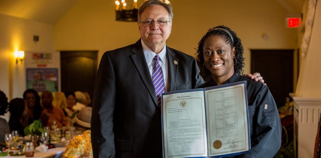 Chef Harris with several dishes from the North Louisiana State Meal. Photo by Douglas Collier / The Shreveport Times (all rights reserved; used by permission).