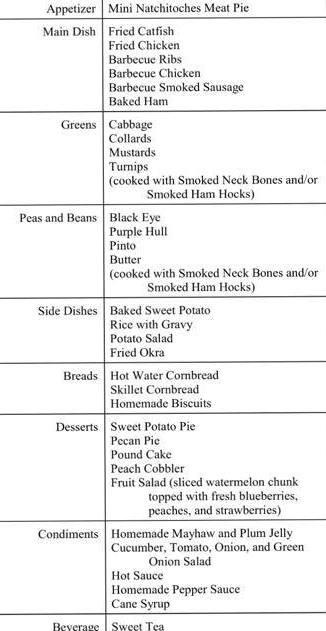 MAIN DISH: Fried Catfish - Fried Chicken - Barbeque Ribs - Barbeque Chicken - Barbeque Smoked Sausage - Baked Ham