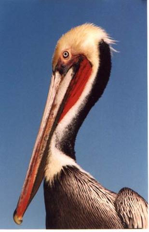 The state bird of Louisiana is unique among the world's seven species of pelicans. The brown pelican is found along the ocean shores and not on inland lakes. It is the only dark pelican, and also the only one that plunges from the air into the water to catch its food.