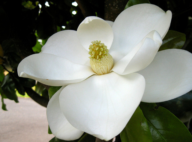 Southern magnolia flower; photo by Rosa Say on Flickr (noncommercial use permitted with attribution / no derivative works).