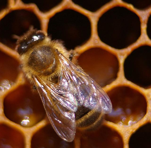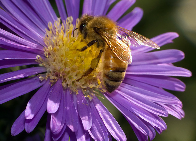 Honeybee on goldenrod; photo by Jim Webber on Flickr (noncommercial use permitted with attribution / share alike).