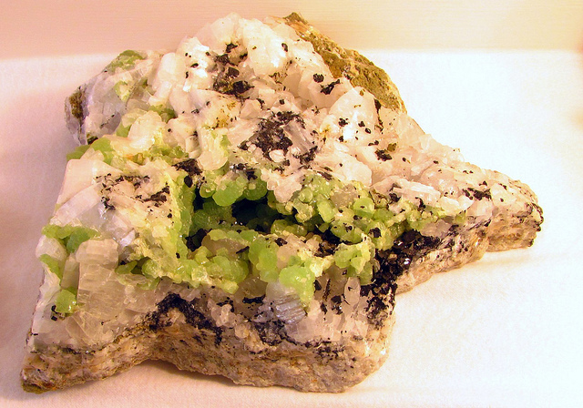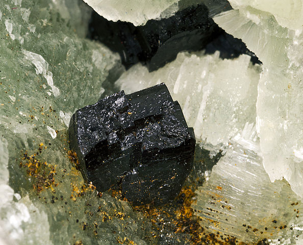 Babingtonite crystal (with green prehnite) from Lane & Sons Traprock quarries, Westfield, Hampden County, Massachusetts; photo by Didier Descouens on Wiikipedia (use permitted with attribution / share alike).