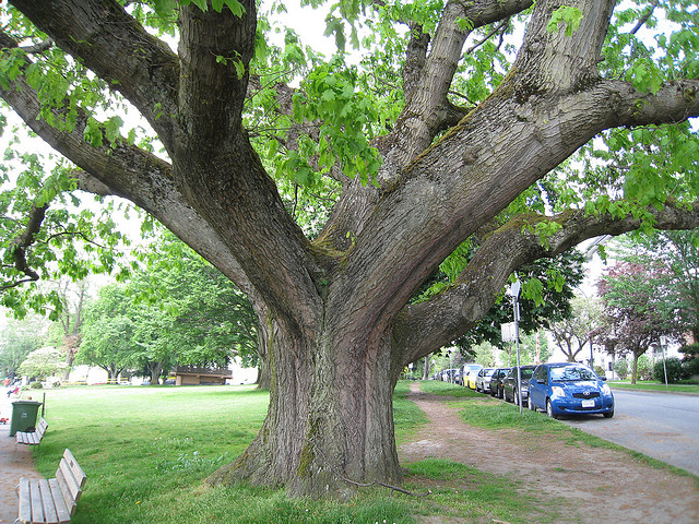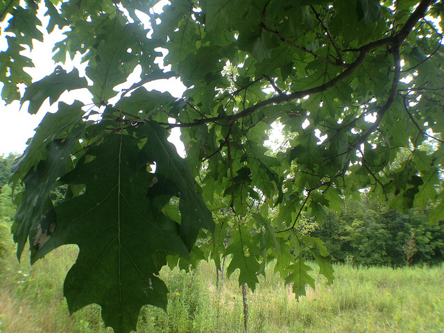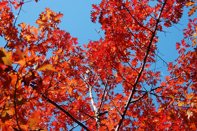 Red oak tree ablaze with fall color; photo by Kevin Harber on Flickr (noncommercial use permitted with attribution / no derivative works).