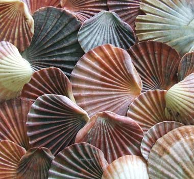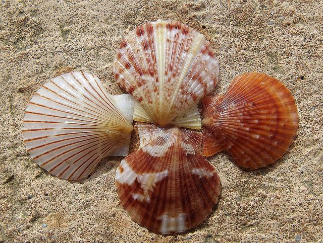Scallop shells; photo by Parée on Flickr (noncommercial use permitted with attribution / share alike).