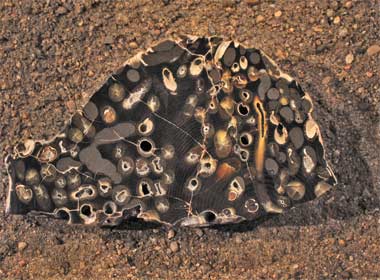 North Dakota Heritage Center exhibit: Teredo-bored petrified wood from Cannonball Formation, Morton County, ND; photo courtesy of North Dakota Geological Survey / Dept. of Paleontology (all rights reserved; used by permission).