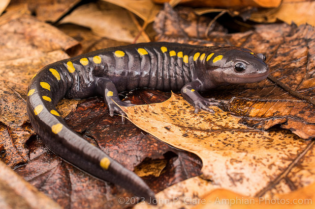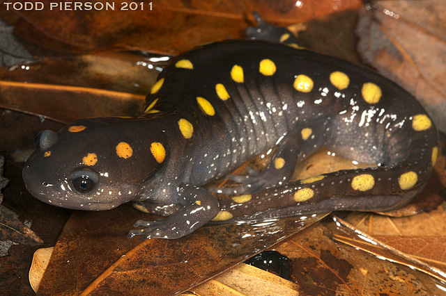 Spotted salamander (Ambystoma maculatum); photo by Todd Pierson on Flickr (noncommercial use permitted with attribution / share alike).