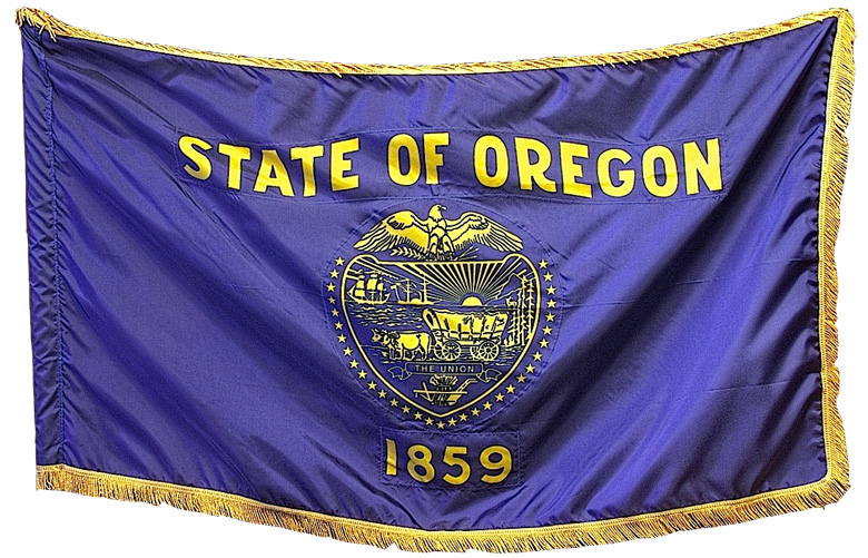 The Oregon flag has gold lettering and symbols on a field of navy blue (Oregon's state colors). The flag's face displays part of the state seal and the words "STATE OF OREGON" and "1859" (the year Oregon was admitted to the Union). The parade flag (or "dress flag") has a gold fringe, but the utility flag has a plain border.