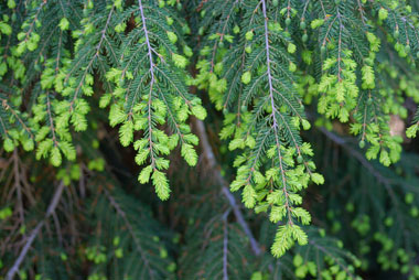 Eastern hemlock tree (Tsuga canadensis) boughs with new growth; photo by Eric Hunt on Flickr (noncommercial use permitted with attribution / no derivative works)