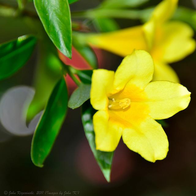 Carolina yellow jessamine flowers; photo by Images by John 'K' on Flickr (noncommercial use permitted with attribution / no derivative works).