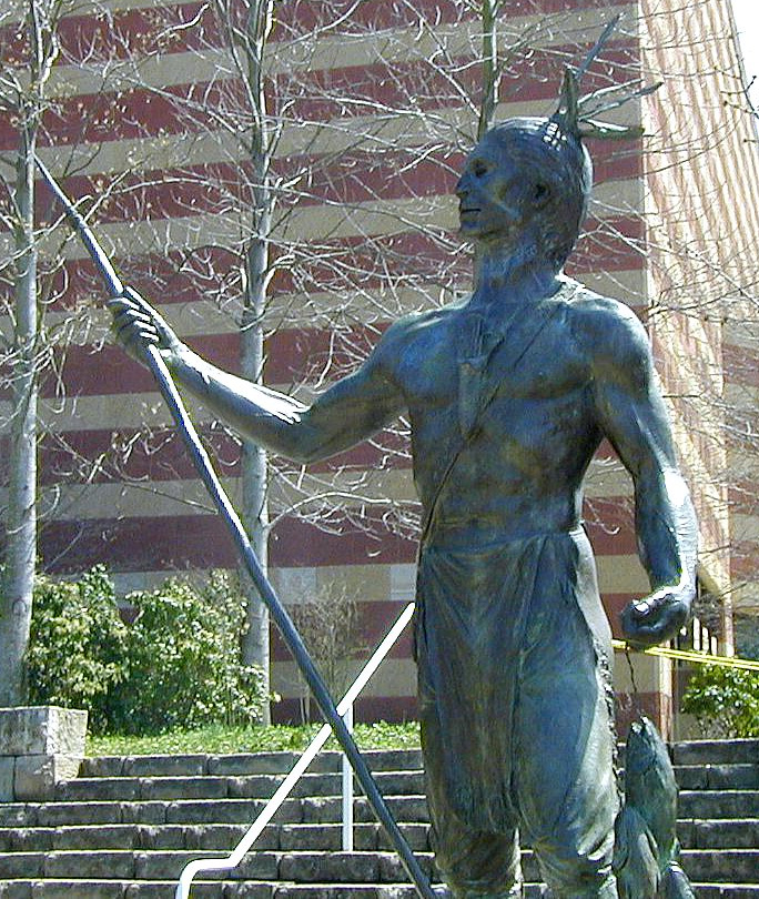 A statue of a Cherokee Indian in front of the Tennessee Aquarium; Chattanooga, Tennessee; photo by Duane Tate on Flickr (use permitted with attribution).