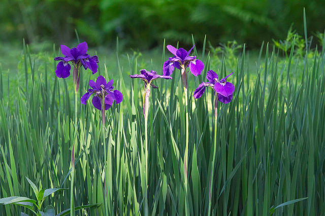 Purple iris flowers; photo by cobalt123 on Flickr (noncommercial use permitted with attribution / share alike).