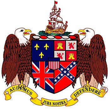 The shield is supported by bald eagles on either side (symbols of courage). The crest of the shield represents the Baldine (the ship sailed by Iberville and Bienville from France in 1699 to settle a colony near present-day Mobile, AL).