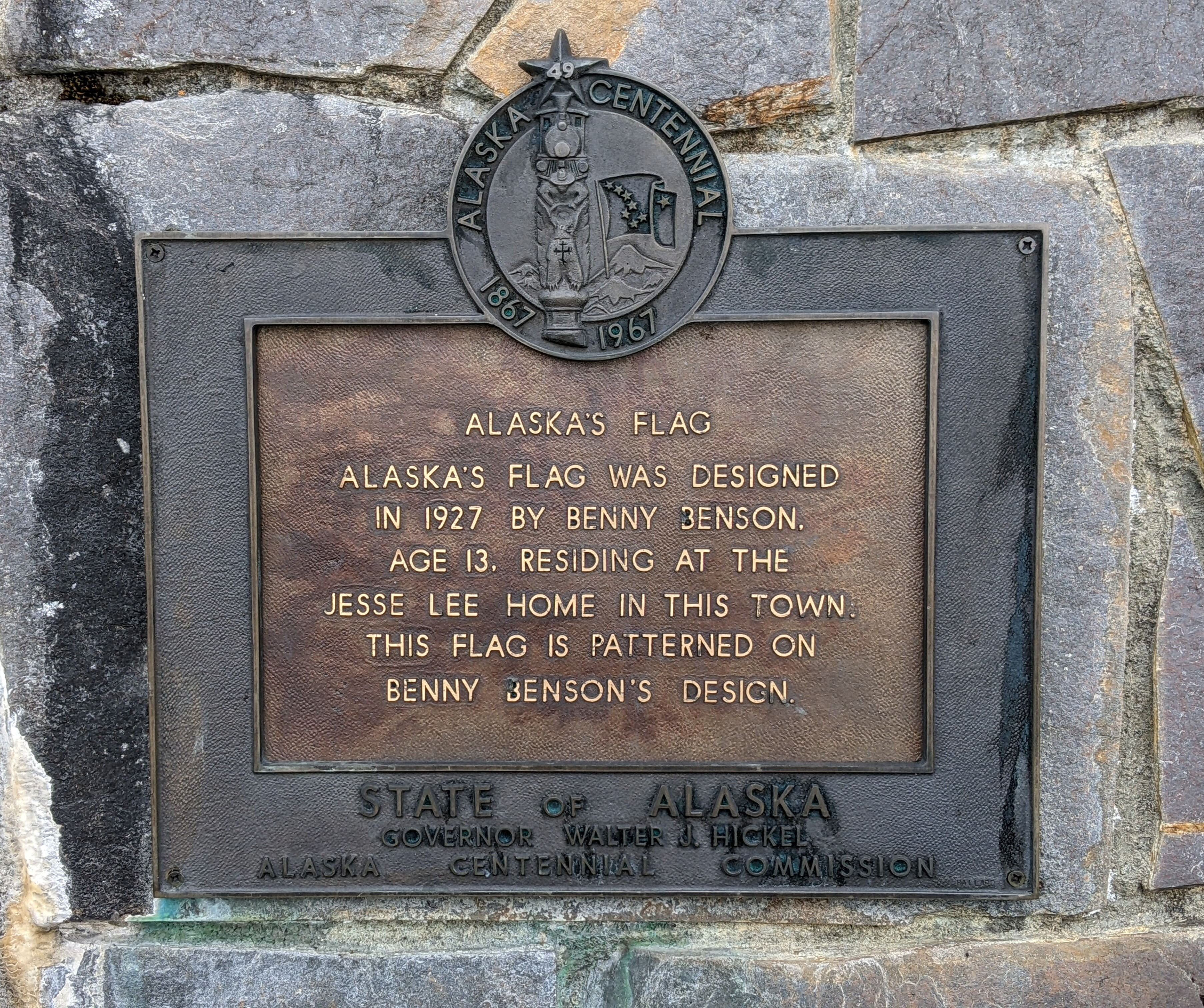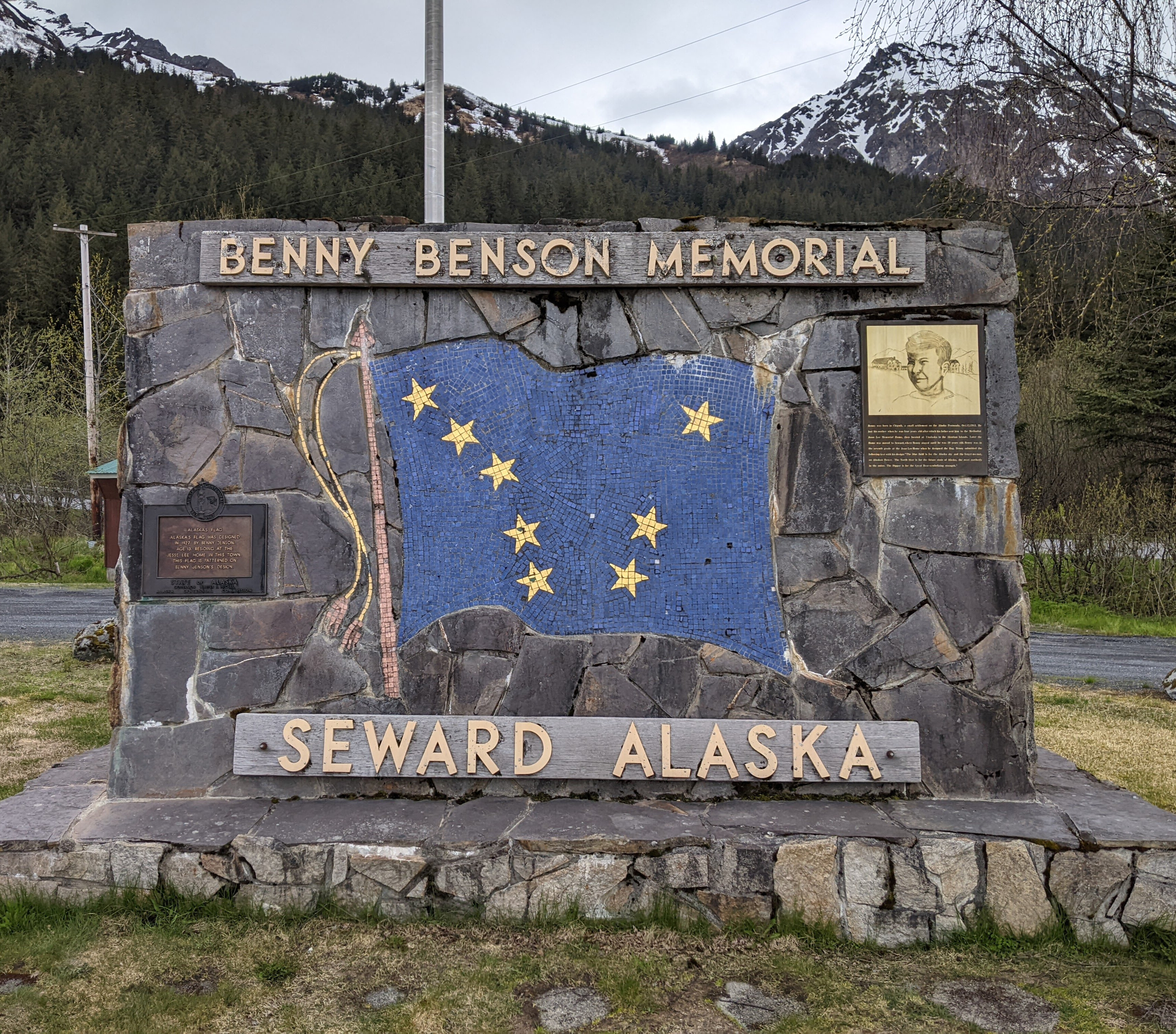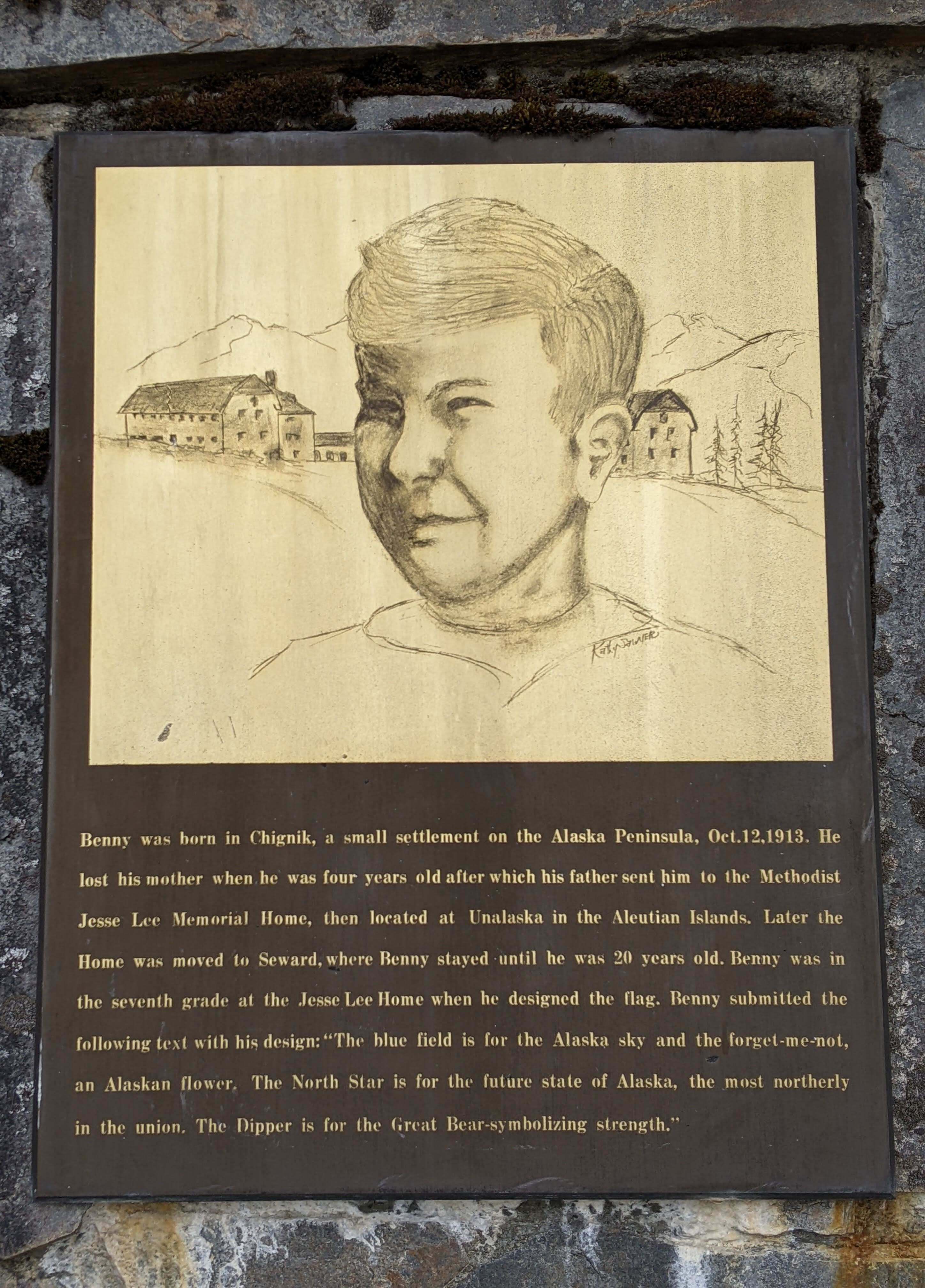 The Alaska state flag (selected for its simplicity, originality, and symbolism) was created by Benny Benson, a 13-year-old 7th grader from an orphanage in Seward, Alaska (John Bell Bensona; 1913-1972). Seward honors him with a monument on 3rd Avenue. Benny entered a flag design contest to create a symbol for the territory of Alaska. Little did he know that his simple yet profound design would become a lasting emblem of Alaskan pride. Benny submitted this description with his design: