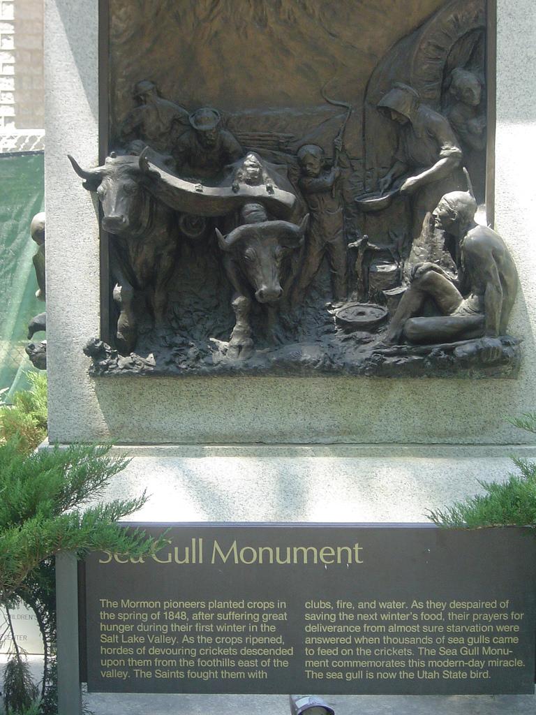"The Mormon pioneers planted crops in the spring of 1848, after suffering great hunger during their first winter in the Salt Lake Valley. As the crops ripened, hordes of devouring crickets descended upon them from the foothills east of the valley. The Saints fought them with clubs, fire, and water. As they despaired of saving the next winter's food, their prayers for deliverance from almost sure starvation were answered when thousands of sea gulls came to feed on the crickets. The Sea Gull Monument commemorates this modern-day miracle. The sea gull is now the Utah State bird."