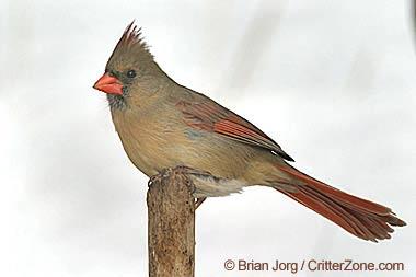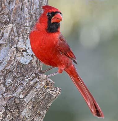 Male cardinals are a brilliant scarlet red, females a buffy-brown with reddish wings - both have a jet-black mask, pronounced crest, and heavy bill. The cardinal sings nearly year-round, and the male aggressively defends his 4-acre territory (male cardinals have been seen attacking small red objects mistaken as other males).