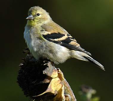 Also called American goldfinch or wild canary, the male willow goldfinch has a bright yellow body with black wings and tail, and black on top of his head. The female's plumage is more muted with an olive-yellow body and dark brown tail and wings (the male goldfinch also displays this same dull plumage in the winter months).