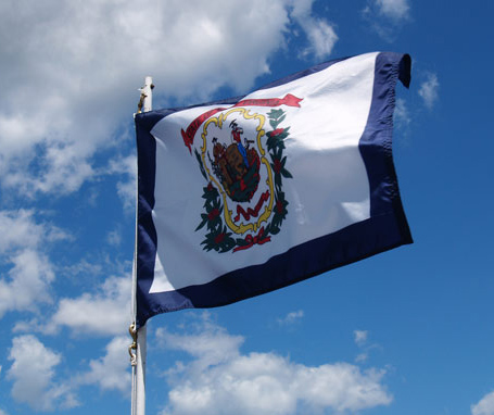 West Virginia state flag waving proudly against a blue sky. Photo by Angela / Flickr (noncommercial use permitted with attribution/no derivative works).
